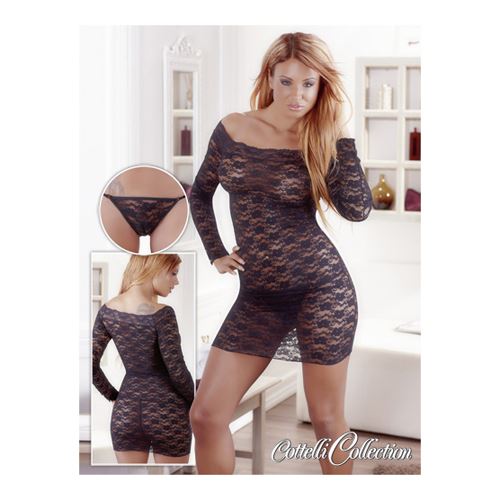 Anschmiegsames, schmales Langarm-Minikleid aus schwarzer Spitze inklusive dazu passendem String. 94% Polyamid, 6% Polyester.