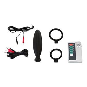 Elektrosex-Set von Dusedo mit zwei Penisringen, einem Buttplug mit optionaler Unterseite aus Silikon und einer schmalen aber leistungsstarken Box mit zwei Frequenzen und vier vorprogrammierten Stufen. Die Box ist auch mit einem Knopf, mit dem die Geschwin