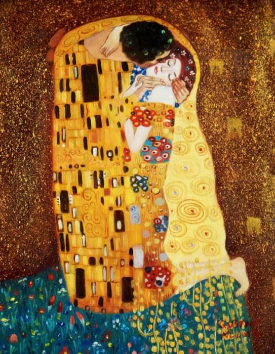 Gustav Klimt - Der Kuss a92097 30x40cm Jugendstil Ölgemälde handgemalt Dieses Gemälde ist meisterhaft mit Ölfarben handgemalt und auf fester Leinwand verewigt. Achtung, kein Kunstdruck! Alle alten Meister sind handgemalte Reproduktionen! Sie sehen hier das Originalfoto von dem Gemälde. Sie erhalten das Gemälde ohne das KD24 Logo