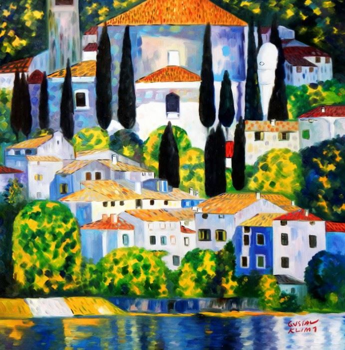 Gustav Klimt - Kirche in Cassone g92347 80x80cm Ölgemälde handgemalt Dieses Gemälde ist meisterhaft mit Ölfarben handgemalt und auf fester Leinwand verewigt. Achtung, kein Kunstdruck! Alle alten Meister sind handgemalte Reproduktionen! Sie sehen hier das Originalfoto von dem Gemälde. Sie erhalten das Gemälde ohne das KD24 Logo