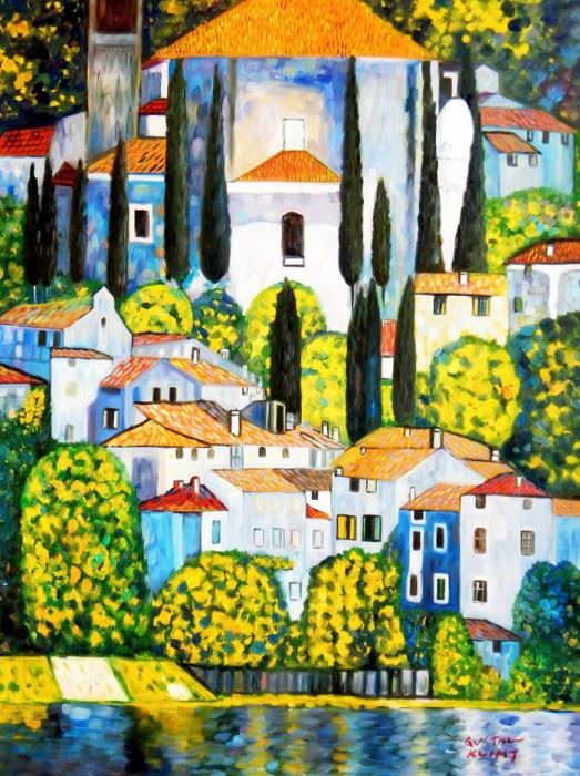 Gustav Klimt - Kirche in Cassone i92481 80x110cm Ölgemälde handgemalt Dieses Gemälde ist meisterhaft mit Ölfarben handgemalt und auf fester Leinwand verewigt. Achtung, kein Kunstdruck! Alle alten Meister sind handgemalte Reproduktionen! Sie sehen hier das Originalfoto von dem Gemälde. Sie erhalten das Gemälde ohne das KD24 Logo
