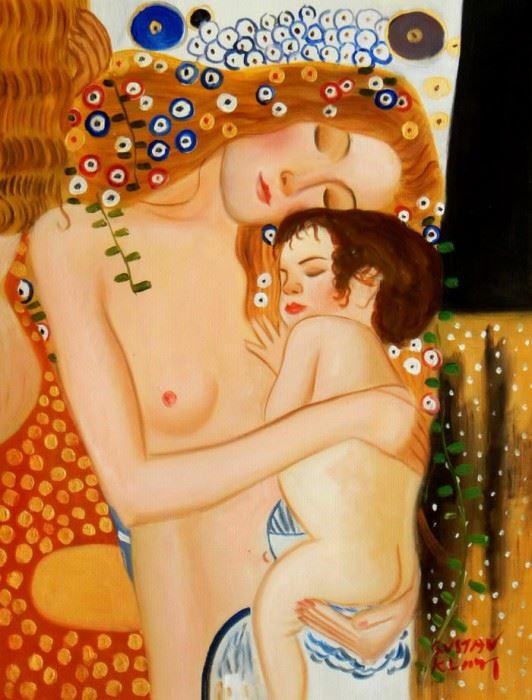 Gustav Klimt - Mutter mit Kind a91545 30x40cm Jugendstil Ölgemälde handgemalt Dieses Gemälde ist meisterhaft mit Ölfarben handgemalt und auf fester Leinwand verewigt. Achtung, kein Kunstdruck! Alle alten Meister sind handgemalte Reproduktionen! Sie sehen hier das Originalfoto von dem Gemälde. Sie erhalten das Gemälde ohne das KD24 Logo