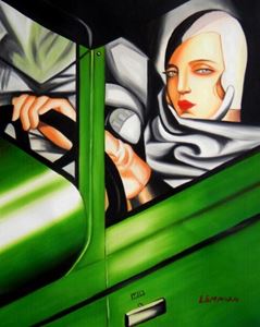 Homage of T. de Lempicka - Tamara im grünen Bugatti b88459 40x50cm Ölbild handgemalt Dieses Gemälde ist meisterhaft mit Ölfarben handgemalt und auf fester Leinwand verewigt. Achtung, kein Kunstdruck! Alle alten Meister sind handgemalte Reproduktionen! Sie sehen hier das Originalfoto von dem Gemälde. Sie erhalten das Gemälde ohne das KD24 Logo