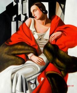 Homage to T. de Lempicka - Portrait der Madame Boucard c92145 50x60cm Art Deco Ölgemälde handgemalt Dieses Gemälde ist meisterhaft mit Ölfarben handgemalt und auf fester Leinwand verewigt. Achtung, kein Kunstdruck! Alle alten Meister sind handgemalte Reproduktionen! Sie sehen hier das Originalfoto von dem Gemälde. Sie erhalten das Gemälde ohne das KD24 Logo