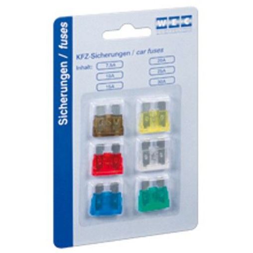 Sortiment Kfz-Sicherungen - Blisterkarte mit Euroaufhänger Inhalt: -1 Stück mit 7,5 A -1 Stück mit 10 A -1 Stück mit 15 A -1 Stück mit 20 A -1 Stück mit 25 A -1 Stück mit 30 A