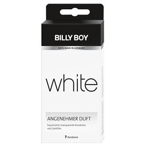 Billy Boy White Kondome - 7 Stück Diese weißen Kondome sind äußerst zart und dennoch stark und verleihen ein natürliches Gefühl. Das Besondere an diesen Kondomen ist der sehr angenehme und subtile Duft. Die glatten, transparenten Kondome sind aus