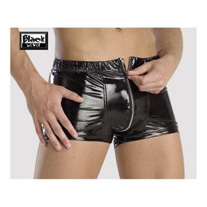 Schwarze Lack-Pants mit langem Front-Reißverschluss. Glänzende 4-Way-Stretch-Lack-Qualität. 85% Polyamid, 15% Elasthan, Beschichtung (Coating) Polyurethan.