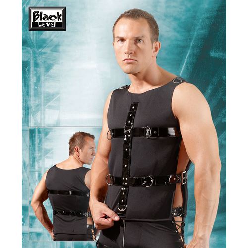 Dieses coole Shirt für Herren ist mit verstellbaren Gurten aus Lack, Schließen und unzähligen Metallringen versehen. Das schwarze Shirt sieht darum nicht nur klasse aus, sondern ist auch noch äußerst funktionell. Merkmale: - Material: 60 % Polyamid,