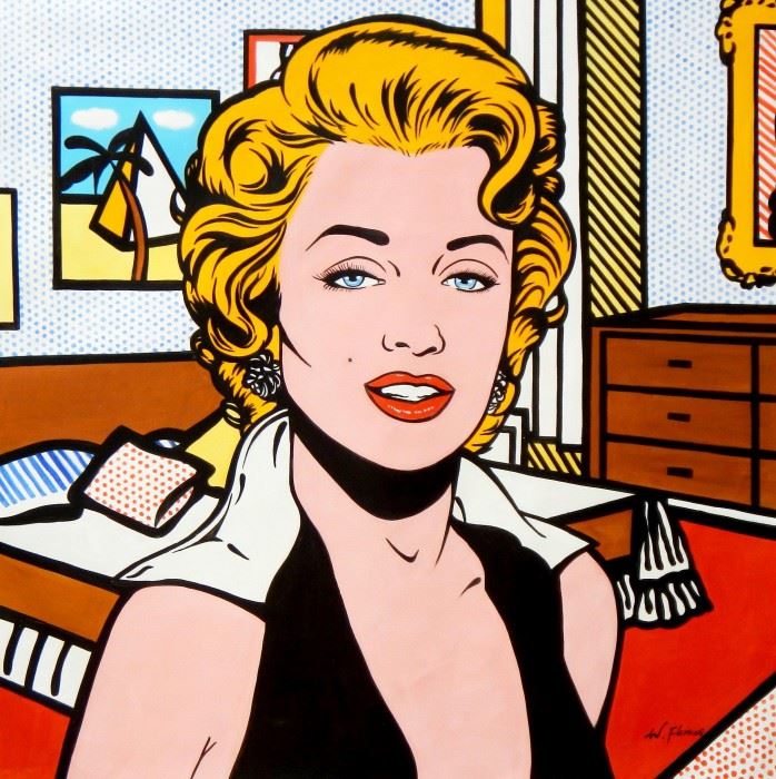Homage to Roy Lichtenstein - Marilyn Monroe m92543 120x120cm modernes Ölbild Dieses Gemälde ist meisterhaft mit Ölfarben handgemalt und auf fester Leinwand verewigt. Achtung, kein Kunstdruck! Alle alten Meister sind handgemalte Reproduktionen! Sie sehen hier das Originalfoto von dem Gemälde. Sie erhalten das Gemälde ohne das KD24 Logo