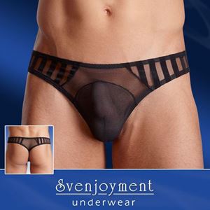 String für Männer in Schwarz aus leicht transparentem Material und mit zwei Prints. Mit dunklem Material auf Höhe des Schritts und Streifen an den Seiten und auf der Rückseite. Mit kleinen Kanten abgesetzt. Sehr fein und einladend zu tragen! Material: