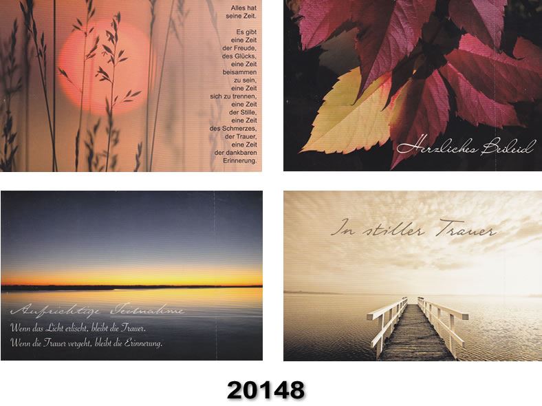 Alle Karten werden als Set angeboten, pro Set 30 Karten in einer Box / Display. Motive: 6 Motive Sprache: Deutsch Format: 11,5 x 17,5 cm, Querformat Jede Karte ist mit einem Trauermschlag versehen und einzeln cellophaniert.