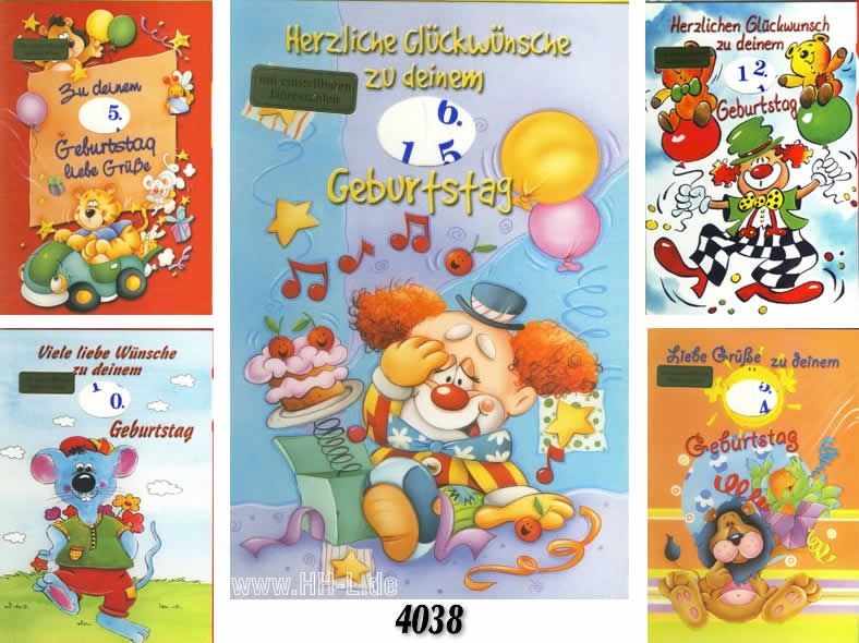Geburtstags-Karte 6fach sortiert gezeichnete, lustige Motive mit Clowns und verschiedenen Tieren 2 verstellbare Zahlenkränze für die Altersangabe von 1 bis 19 Jahren Format hoch 17cm, breit 11,5cm Mit Glückwunsch-Texten, z.B.:Herzliche Glückwünsche zu dei
