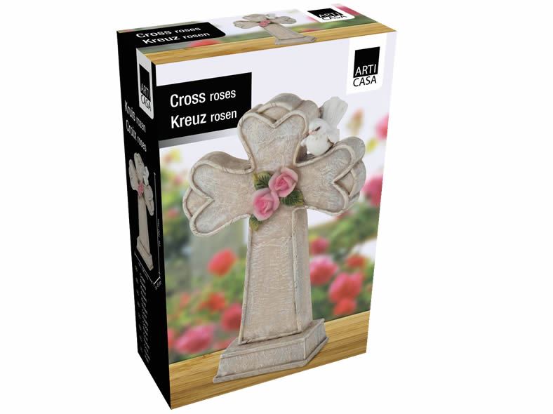 Grabschmuck Kreuz mit Rosen aus Polyresin, Größe 10,5 x 4,5 x 16 cm im Geschenkkarton