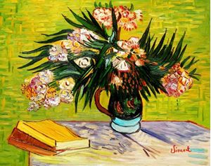 Vincent van Gogh - Vase mit Oleandern und Bücher b91598 40x50cm Ölbild handgemalt Dieses Gemälde ist meisterhaft mit Ölfarben handgemalt und auf fester Leinwand verewigt. Achtung, kein Kunstdruck! Alle alten Meister sind handgemalte Reproduktionen! Sie sehen hier das Originalfoto von dem Gemälde. Sie erhalten das Gemälde ohne das KD24 Logo