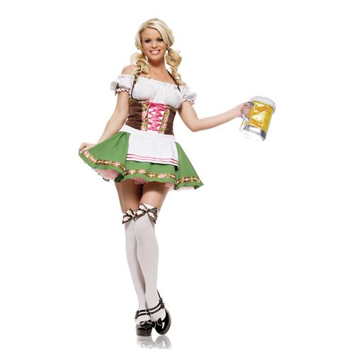 2-teiliges Gretchen-Kostüm mit Kleid und Strümpfen mit Schleifchen. In diesem Kleidchen sind Sie gekleidet wie eine echte Oktoberfest-Kellnerin! Das Röckchen ist grün und das Kleidchen hat pinkfarbene Akzente. Schulterfrei, für eine sexy Ausstrahlung.