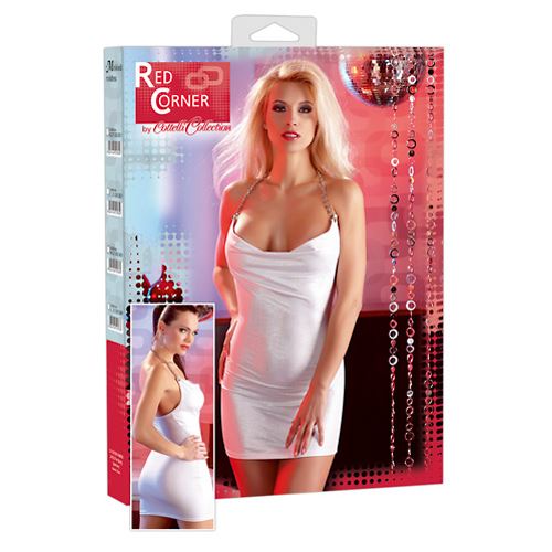 Eng anliegendes Minikleid im weißen Silberglanz, mit Wasserfallausschnitt vorne und silberfarbenem Ketten-Neckholder. 92% Polyester, 8% Elasthan.