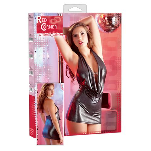 Silberfarbenes Minikleid mit tiefem Wasserfall-Ausschnitt, der von einem Strassband gehalten wird. Mit Neckholder. 92% Polyester, 8% Elasthan.