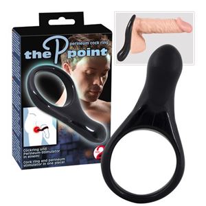 Schwarzer Penisring in Kombination mit integriertem P-Punkt-Stimulator (ca. 6 cm lang), der die Region zwischen Anus und Hodensack gezielt reizt. Ring-Ø 5 cm. Wenig dehnbar. Material: Silikon, phthalatfrei gemäß EU-Verordnung 1907/2006/EC.