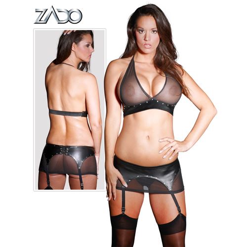 Neckholder-Top mit Elastikriemen im Rücken und Straps-Minirock mit kleiner Schnürung hinten. Schwarzes Lammnappa-Leder mit Nietenverzierung in Kombination mit Powernet (90% Polyester, 10% Elasthan). Ohne Strümpfe. Enthält nicht textile Teile tierischen Ur