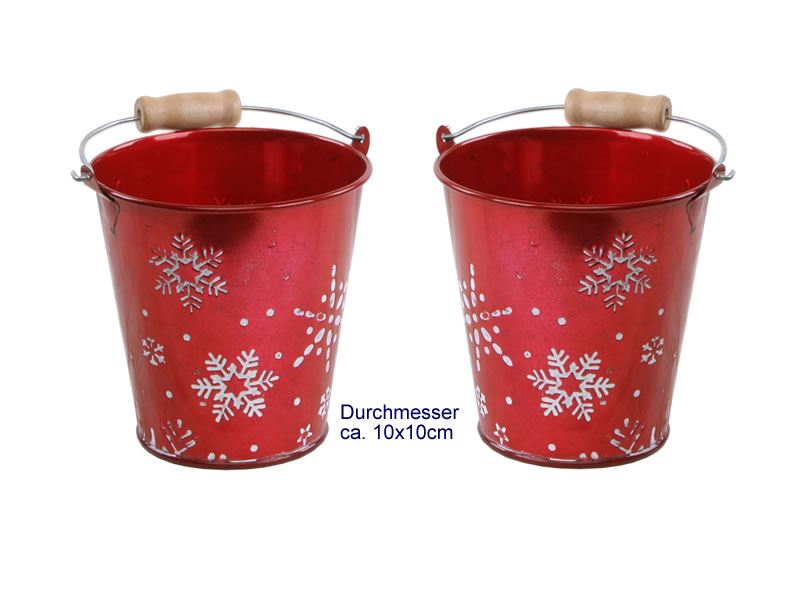 Eimer weihnachtlich rot aus Metall S, Holzgriff, Muster geprägt DH:10x10cm