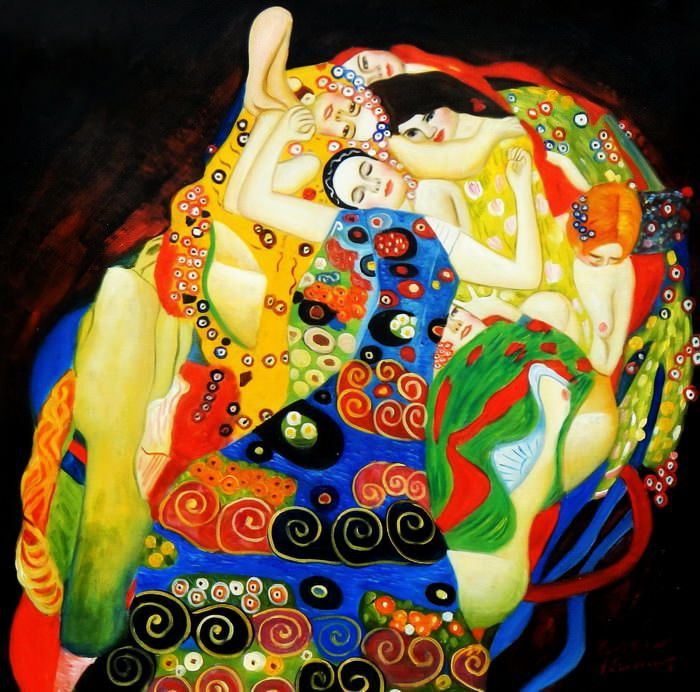 Gustav Klimt - Jungfrauen e91762 60x60cm Jugendstil Ölgemälde handgemalt Dieses Gemälde ist meisterhaft mit Ölfarben handgemalt und auf fester Leinwand verewigt. Achtung, kein Kunstdruck! Alle alten Meister sind handgemalte Reproduktionen! Sie sehen hier das Originalfoto von dem Gemälde. Sie erhalten das Gemälde ohne das KD24 Logo