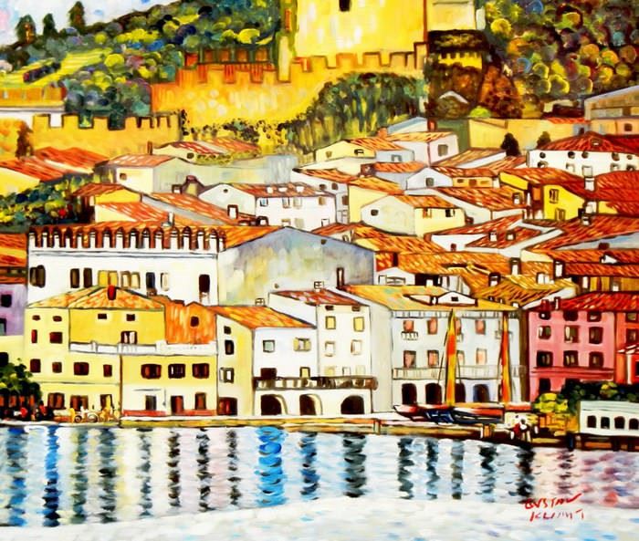 Gustav Klimt - Malcesine am Gardasee c91649 50x60cm Ölbild handgemalt Dieses Gemälde ist meisterhaft mit Ölfarben handgemalt und auf fester Leinwand verewigt. Achtung, kein Kunstdruck! Alle alten Meister sind handgemalte Reproduktionen! Sie sehen hier das Originalfoto von dem Gemälde. Sie erhalten das Gemälde ohne das KD24 Logo
