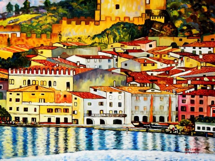 Gustav Klimt - Malcesine am Gardasee i92483 80x110cm Ölbild handgemalt Dieses Gemälde ist meisterhaft mit Ölfarben handgemalt und auf fester Leinwand verewigt. Achtung, kein Kunstdruck! Alle alten Meister sind handgemalte Reproduktionen! Sie sehen hier das Originalfoto von dem Gemälde. Sie erhalten das Gemälde ohne das KD24 Logo