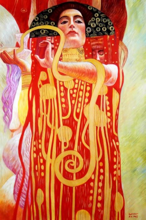 Gustav Klimt - Medizin p92454 120x180cm eindrucksvolles Gemälde handgemalt Dieses Gemälde ist meisterhaft mit Ölfarben handgemalt und auf fester Leinwand verewigt. Achtung, kein Kunstdruck! Alle alten Meister sind handgemalte Reproduktionen! Sie sehen hier das Originalfoto von dem Gemälde. Sie erhalten das Gemälde ohne das KD24 Logo