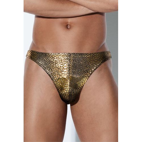 Herrenstring in ansprechender Ausführung aus Stretchmaterial mit komfortabler Passform. Der geräumige Beutel mit gut abschließenden Säumen und die goldfarbene Beschichtung mit Croco-Details verleihen dem String einen witzigen Show-Effekt.
