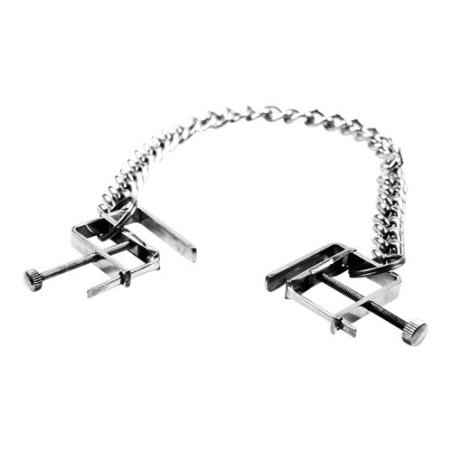 Diese Nippelklemmen sind mittels einer Metallkette miteinander verbunden. Entscheiden Sie selbst, wie fest die Klemmen sitzen sollen. Durch Drehen der Schrauben lässt sich der Druck der Nippelklemmen verstellen. Sie haben es in der Hand, wie intensiv Sie
