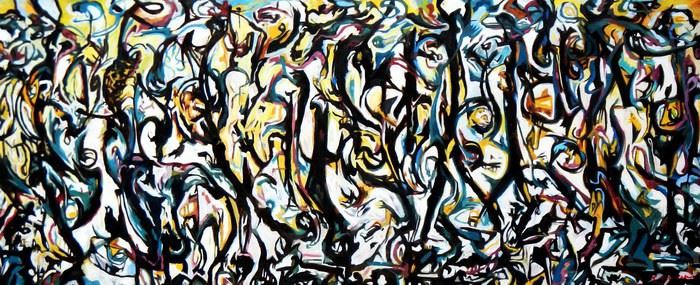 Homage to Pollock - Mural t91921 75x180cm fantastisches Ölbild handgemalt Dieses Gemälde ist meisterhaft mit Ölfarben handgemalt und auf fester Leinwand verewigt. Achtung, kein Kunstdruck! Alle alten Meister sind handgemalte Reproduktionen! Sie sehen hier das Originalfoto von dem Gemälde. Sie erhalten das Gemälde ohne das KD24 Logo
