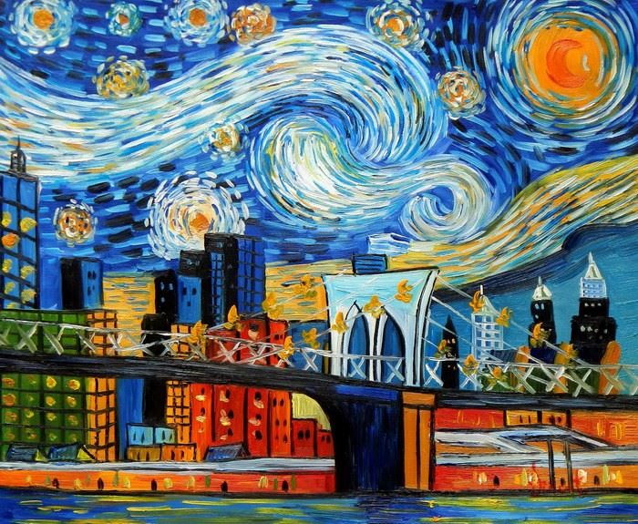 Vincent van Gogh - Homage New Yorker Sternennacht c92175 50x60cm Ölgemälde handgemalt Dieses Gemälde ist meisterhaft mit Ölfarben handgemalt und auf fester Leinwand verewigt. Achtung, kein Kunstdruck! Alle alten Meister sind handgemalte Reproduktionen! Sie sehen hier das Originalfoto von dem Gemälde. Sie erhalten das Gemälde ohne das KD24 Logo