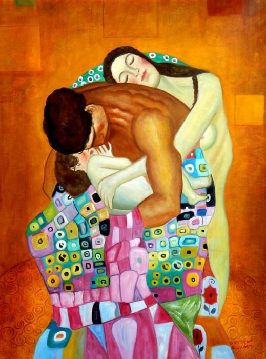 Gustav Klimt - Die Familie k92412 90x120cm Jugendstil Ölbild Dieses Gemälde ist meisterhaft mit Ölfarben handgemalt und auf fester Leinwand verewigt. Achtung, kein Kunstdruck! Alle alten Meister sind handgemalte Reproduktionen! Sie sehen hier das Originalfoto von dem Gemälde. Sie erhalten das Gemälde ohne das KD24 Logo